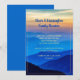 Family reunion invitation for a mountain gathering. Bold blue colors depict a rolling mountain range with sunset colors on the horizon. This is the background for text in two templates. Dark blue modern script at the top is where the name, or names, will be mentioned along with type of gathering. Casual, uppercase printed font in yellow is used for the remainder of the invitation. Easily include a website link, reply information and whatever is needed for your event which could also be a class, or friends, reunion. A gold thin line borders the 5x7 inch cards. Reverse is solid deep blue.