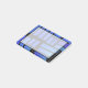 A geometric pattern with varying sizes of rectangle shaped tiles in pretty shades of blue and purple on a black background. Center has a a transparent box with a black border.