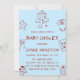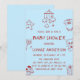 Celebrate the mom-to-be with this adorable blue baby shower invitation featuring charming hand-drawn baby illustrations including a mobile, teddy bear, rattle, baby shoes, and gift box.