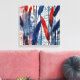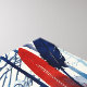 This vibrant artwork depicts a dense forest scene using a unique graphic technique reminiscent of linocut stamping. The trees are illustrated in black and white, with bold, flat lines contrasting against a dynamic background of blue, red , and black watercolor textures. The composition creates a striking juxtaposition between the monochrome trees and the colorful abstract backdrop, giving the image a blend of natural beauty and artistic flair.