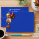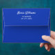blue background. Personalize and add a name and your return address. The name is written with a modern and trendy handlettered style script. Christmas decor, baubles in red and gold.