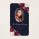 Elegant blue and silver floral memory card/funeral prayer card featuring a photo adorned with blush pink and burgundy red watercolor roses and baby's breath flowers on a dark blue background.