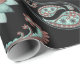 Elegant vintage floral paisley pattern in turquoise and red over a black background.