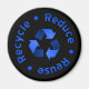 Black and blue reduce - reuse - recycle magnet with blue recycling symbol.