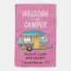 Here's a cute camper or yard sign for those camping trips! Each side has a retro image hippy style blue camper with a pink heart flower design. The camper image is placed on a bright pink background, with your custom text in white and black above and below the camper image. All the text is customizable. Both sides have the same image and text.