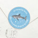 This design features a return address circle sticker, with an ocean nautical, blue watercolor, blue sharks, perfect for summer pool party, great white shark, a cute whimsical, a simple minimalist, under the sea party, jawsome theme.