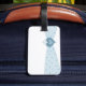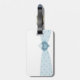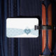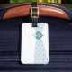 A classy tag for travelling featuring a light blue ribbon with little heart accents.