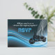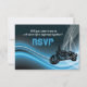 Blue road biker wedding RSVP response card, featuring a motorcycle on an abstract gradient blue, white, black background and a white mesh. Some elements courtesy of Clipartandfonts.com.