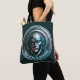 A great science fiction tote bag featuring front and back a chilling blue robot mask with metallic effect. The text reads "Rise of the AI dominioN" but you can change it if you like. It's a nod in the direction of how artificial intelligence could lead to a dreadful future where machines have dominance over humans.