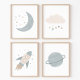 Add a finishing touch to your little one's space with this watercolor rocket, moon, cloud and planet set of prints.