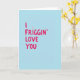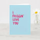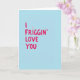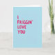 This card features the words “I FRIGGIN’ LOVE YOU” in bright fuchsia on a sky-blue background. The message sits toward the left side, leaving open space around it so your eyes go straight to the words. The letters look hand-drawn, with slightly uneven lines and changing thickness, like someone wrote it quickly because they couldn’t hold it in. The contrast between the pink and blue feels both sweet and confident, giving the whole card a warm, upbeat mood ❤️. The word “friggin’” adds a little grin to the message, making it feel honest and real instead of overly serious 🥰. A small pink dot under “YOU” works like a tiny finishing mark that makes the note feel complete. It’s a meaningful card to give when you want to say “I love you” in a simple way that still feels full of heart. Hope it helps you share your Valentine’s Day sentiments with someone you care about.