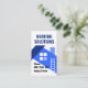 Cover features a creative blue rooftop building design. Over at the top is the the business name "ROOFING SOLUTIONS" which you can change. Your prestigious name and phone contact are located near the base of the card.