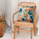 Here's a beautiful throw pillow with an autumn floral pattern in tones of bright blue, soft green, and orange red. The stars in the pattern are gorgeous blue roses, and the warm colors of the leaves complement them. The pattern is placed on a white background. The back of the pillow has the same pattern.