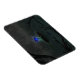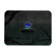 A dark, still pond surrounded by leafless trees. On a rock in the middle of the water, a single, glowing, blue rose.