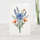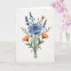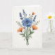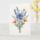 Designed with a centered bouquet on a softly textured white background, this card feels gentle and close, like flowers offered with a quiet smile ❤️. A fully open rose in calm blue sits in the middle, its layered petals shaded with smooth transitions that give it depth and a velvety look. Around it, warm orange-gold blossoms add a cozy contrast, like a friendly hand reaching in beside the cooler tones. Slender deep-indigo sprigs weave through the arrangement, bringing a soft, intimate rhythm to the mix as if the stems are leaning toward one another. Green leaves in many shades—muted olive to deep forest—curl and overlap with loose watercolor washes, creating a natural, upward flow. There is no printed message, leaving open space above and around the bouquet for the artwork to speak for itself 🌼. The paint edges stay fluid and slightly blended, and the bouquet remains neatly centered against the pale, lightly speckled background.