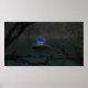 A dark, still pond surrounded by leafless trees. On a rock in the middle of the water, a single, glowing, blue rose.