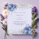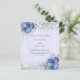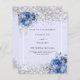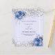 A soft lavender colored background decorated with blue roses, flowers and faux silver confetti. Personalize and add your names and wedding details. Black letters.