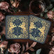 Add royal charm to your tablescape! These custom wedding coasters feature a majestic lion and floral design with your names and monogram, all in luxurious gold against a blue background. Perfect for a medieval fantasy celebration with timeless elegance!