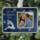 Capture the warmth of the season with this Blue Rustic Christmas Reindeer Framed Photo Ornament, featuring a charming Christmas reindeer and falling snowflakes set against a cozy rustic wood background. The simple layout and festive typography beautifully showcase your favorite photo, making it a heartfelt holiday photo keepsake. Perfect for celebrating our first Christmas and adding a touch of rustic charm to your Christmas decor.