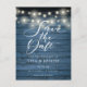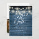 This rustic save the date card features pretty string lights and an elegant script save the date above your details set in elegant typography on a rustic blue wood panels background. The reverse features your special photo and has additional save-the-date details, including your wedding website QR code, with your return address and space for your recipient's address. Designed by Thisisnotme©