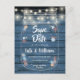 Features string lights above an artsy mason jar filled with your personalized save the date details and scattered delicate flowers on a blue rustic wood panels background. Designed by Thisisnotme©