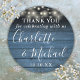 Rustic signature script wedding favor thank you classic round sticker featuring pretty string lights and signature style names on a blue wood panels background. Personalize with your special thank you information in chic white typography. Designed by Thisisnotme©