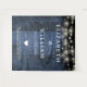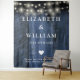 This blue rustic wood boho barn string lights wedding backdrop can be personalized with your information in chic typography. Designed by Thisisnotme©