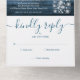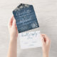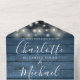 All in one wedding invitation featuring pretty string lights, mason jars, signature style names and chic typography on a blue rustic wood background. The invitation includes a perforated RSVP card that can be individually addressed or left blank for you to handwrite your guest's address details. Designed by Thisisnotme©