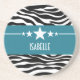 Trendy and modern Sassy Star Zebra Sandstone Coaster featuring a chic black and white zebra print background and a bold royal blue border adorned with a fun star motif. This girly design may be customized with the personalized text of your choosing. Click "Customize It" to find more personalization options.