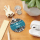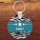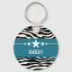 Trendy and modern Sassy Star Zebra Keychain featuring a chic black and white zebra print background and a bold royal blue border adorned with a fun star motif. This girly design may be customized with the personalized text of your choosing. Click "Customize It" to find more personalization options.