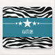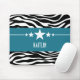 Trendy and modern Sassy Star Zebra Mousepad featuring a chic black and white zebra print background and a bold royal blue border adorned with a fun star motif. This girly design may be customized with the personalized text of your choosing. Click "Customize It" to find more personalization options.