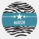 Trendy and modern Sassy Star Zebra Stickers featuring a chic black and white zebra print background and a bold royal blue border adorned with a fun star motif. This girly design may be customized with the personalized text of your choosing. Click "Customize It" to find more personalization options.