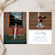 This blue, modern graduation announcement and graduation party invitation features two of your graduates photos with a trendy, wavy border that can be changed to your school colors or any color you like. The front of this design features a large photo and the back features all of the party information. All colors can be changed and all text and photos are editable. Need a navy blue instead of a bright blue? No problem! Easily customize this design or find other options in my Zazzle store.