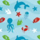 Seamless pattern with sea life, including blue dolphins, red crabs, red and green fish, blue jellyfish, red starfish, blue octopus, and white starfish, on a light blue background with wavy lines. The style is cartoonish and flat, with bold colors and simple shapes.