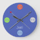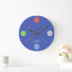 Sewing theme wall clock done in blue with graphics of colorful buttons marking the hours of 12, 3, 6, and 9 o'clock and a pin and sewing needle crossed in the middle. Personalize the white text for your sewing room.