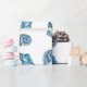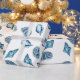 a decorative pattern design of many blue colored seashells on white wrapping paper.