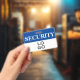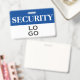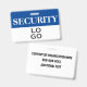 This custom identification badge features a blue and white design with the title "SECURITY" printed in a large white font over a blue background. A sample company or business logo is placed in the center which you can replace with your own custom logo or other image. The back of the security guard ID badge contains contact details and additional information.
