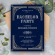 Invite your guests with this vintage Great Gatsby theme bachelor party invitation featuring silver decorative border with elegant typography against a blue background. Simply add your event details on this easy-to-use template to make it a one-of-a-kind invitation. Flip the card over to reveal a beautiful silver stars pattern on the back of the card.