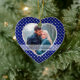 This is a wonderful photo template Christmas ornament for a newlywed couple, or any couple who is celebrating their first Christmas holiday together. Your own photograph is center stage on the front inside a silver lined heart frame which is placed on a blue and silver diamond pattern background. A banner at the bottom holds your custom text in dark blue. The back of the ornament has a silver heart with more custom text on the same background. A beautiful keepsake!