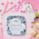 These lovely quinceañera party paper plates feature a border of blue roses on a pale blue watercolor background. A silver tiara, a dark-haired girl in a blue princess dress and small blue butterflies decorate the text. The name of the guest of honor appears in elegant blue handwriting script, with the remaining text in blue sans serif font.