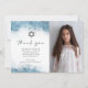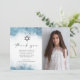 This elegant modern photo bar or bat mitzvah thank you card features a light blue watercolor border design in imitation of marble veined with faux silver foil, fading gradually into the white background. A small Star of David appears above the words "thank you" in charcoal gray handwriting script, with an editable message below in serif capitals. Easily replace the sample image with your favorite photo. The reverse side features a matching blue and silver marble design.