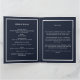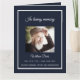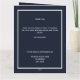 An elegant 4-page program. A dark blue background, a faux silver frame, space for your photo on the front. Personalize and add name, dates and your text.