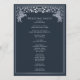 Unveil the magic of your big day! These medieval fantasy wedding programs feature a regal lion surrounded by intricate silver florals and a monogram against a navy blue background, blending elegance with a touch of grandeur. A perfect keepsake for your fairytale celebration! The silver featured on this item is NOT real foil and is printed in flat colors.
