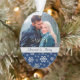 This pretty holiday keepsake ornament features your own photograph, with a bottom border of a silver snowflake pattern on dark blue. A silver gray banner holds your customized text in matching blue. The back of the ornament has the same blue and silver snowflake pattern, with an additional text field. This makes a nice keepsake gift for newlyweds or any couple. *Tip for placing your photograph -- after uploading your photo, use "Customize it" and the arrow keys to move it around for the best appearance.*