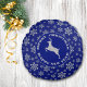 This festive Christmas pillow features a silver snowflake pattern on dark royal blue background. The matching blue center has a silver reindeer image in the center of text that says Merry Christmas and Happy New Year. The other side has the same snowflake pattern, but without the circle or reindeer text. Beautiful decor for the Holiday Season! *Please note - the image is printed and does not contain glitter.*