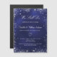 A modern, elegant vow renewal wedding invitation magnet. Navy blue background decorated with faux silver glitter sparkles. The blue color is uneven. Personalize and add your names and party details. White colored letters.