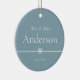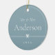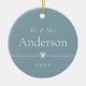 Sweet and simple photo ornament for your first Christmas as a married couple features a minimalist layout, with your titles (shown with "Mr & Mrs"), surname, and the year in clean, classic serif typeface on a soft blue background. A petite bow through the center completes the design. Add a wedding photo to the reverse side.