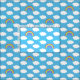 Cute pattern with white clouds, tiny rainbows, on blue for the sky.