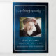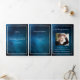An elegant tri-fold program. A dark blue sky as background, faux silver frames and space for a photo. Personalize and add name, dates and your text. White text.