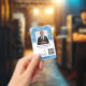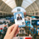 Church ID badge in white and blue with fluffy white clouds against a blue sky. Personalize the ID badge with an ID photo, name and title, the church logo, and a QR code.